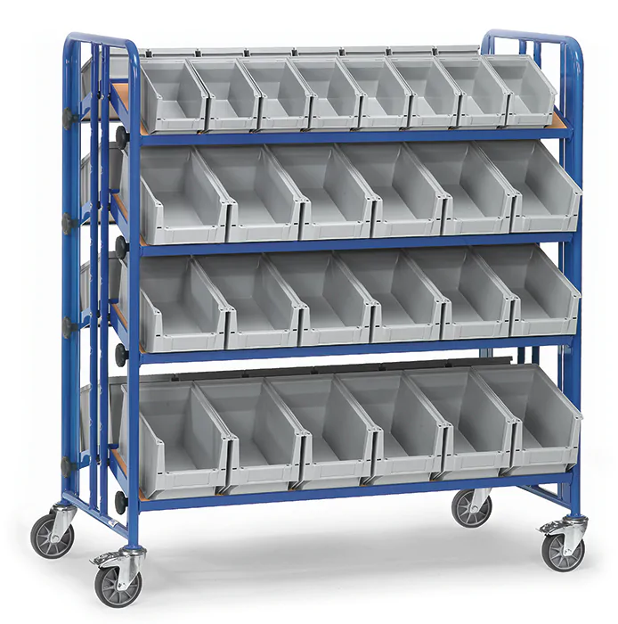Dubbelzijdige etagewagen met 4 etages per zijde, geschikt voor o.a. magazijnbakken.